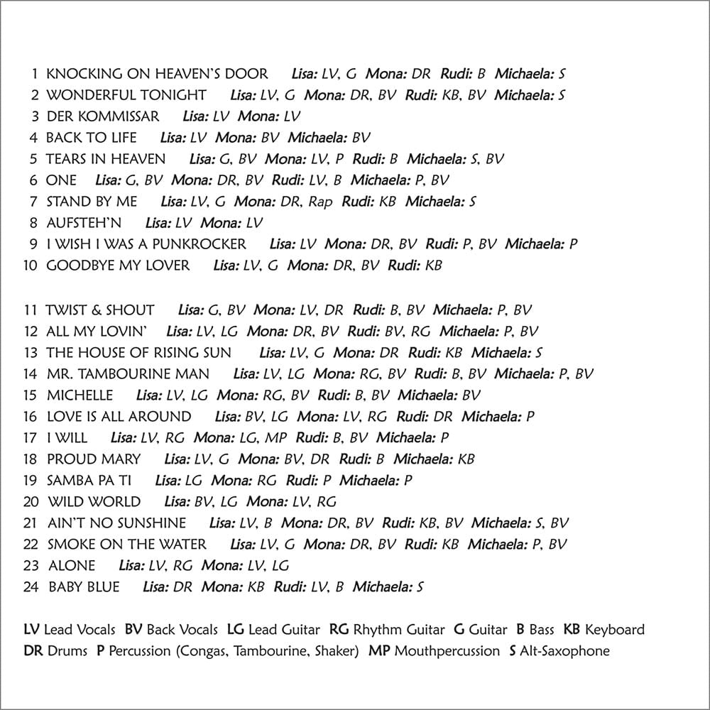 They bring to life some modern songs too in spectacular fashion. For example “Aufstehn” is a cover of a hit German song from 2005 and the girls sound brilliant singing this in German and English. Mona and Lisa’s version of this song blows away the original version by the group Seeed (no surprise there). Just makes you want to stand up and dance. Back to Life, Stand By Me, Der Kommissar, and I wish I was a Punk Rocker are also so wonderful and powerful. Their voices sound just magical together like a force of nature.