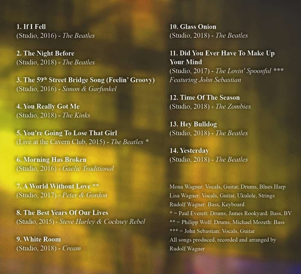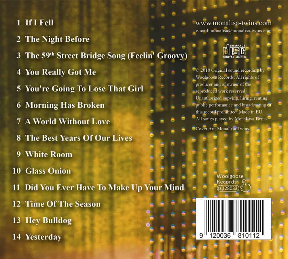 MonaLisa Twins play Beatles & more Vol. 3” is the third cover compilation album released by the MonaLisa Twins. It consists of 14 cover songs, recorded between 2015 and 2018. You will find a lot of Beatles on it but the Twins also covered songs by The Kinks, Cream, Simon & Garfunkel and many more.