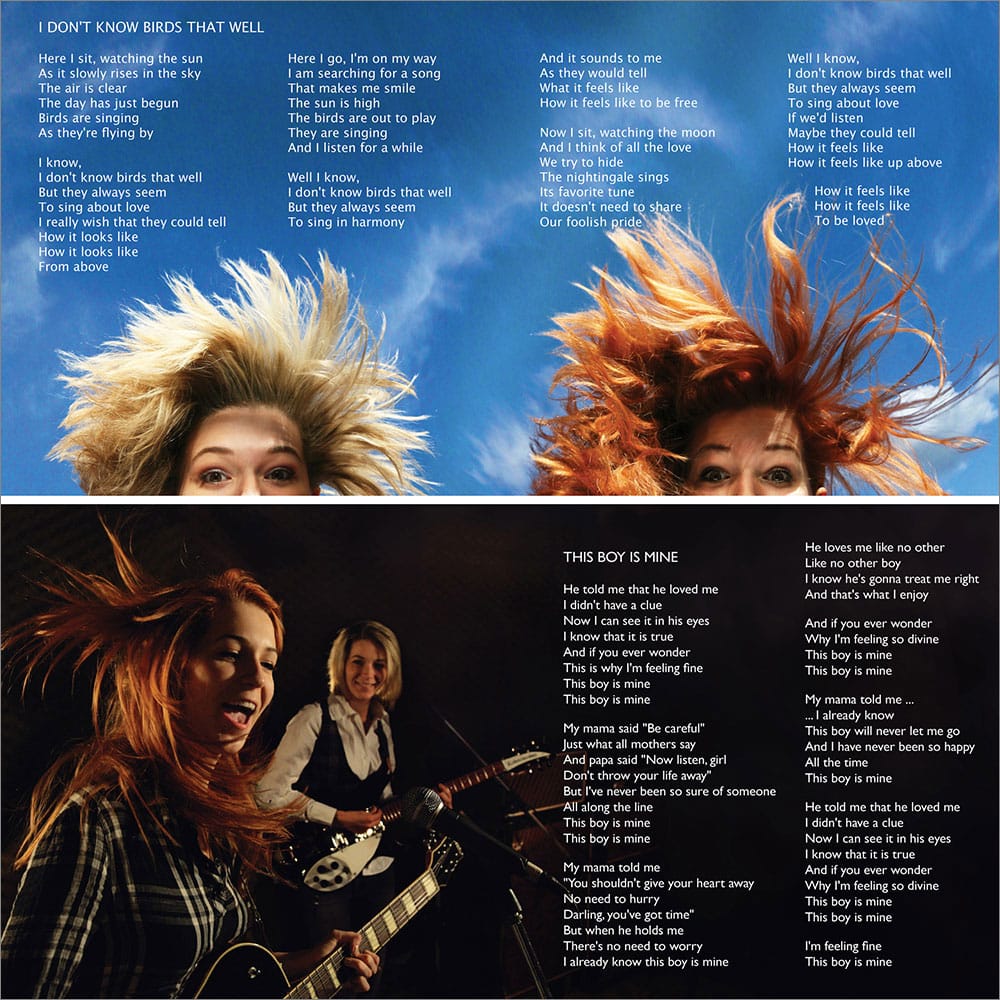 I discovered your music a couple of years ago in the internet. I have followed since then. I have enjoyed the videos on the site, especially the more recent Beatles covers “In My Life” and “While My Guitar Gently Weeps”. I have been anxiously awaiting the release of the CD. Now that it has been released, I have downloaded it, and tonight, I listened straight through. I must say that I am extremely impressed. The entire CD is fantastic. I can see the Beatles’ influence. It is so nice to see two young ladies who don’t care about peer pressure, or being part of the “in” crowd, who appreciate good music, unlike a lot of what you hear on the radio today, and who have the attitudes that you two have against drugs. You two are very talented. Congratulations on what you have accomlished so far, and I hope you both continue to grow in your musical talents and accomplishments. If you decide to make any more cover videos, I would love to hear “Nowhere Man”, “Help” and “Sounds of Silence”. Thank you so much for the musical gift you have given us all to listen to.
